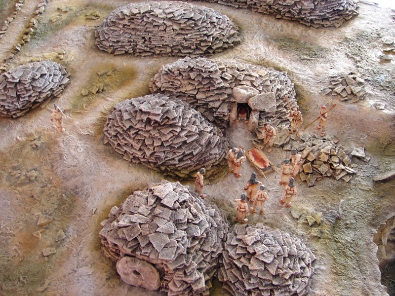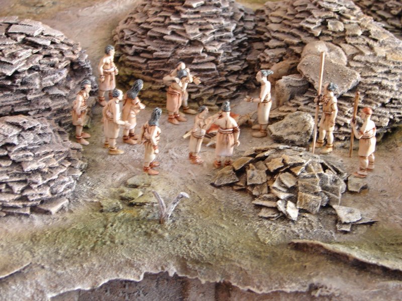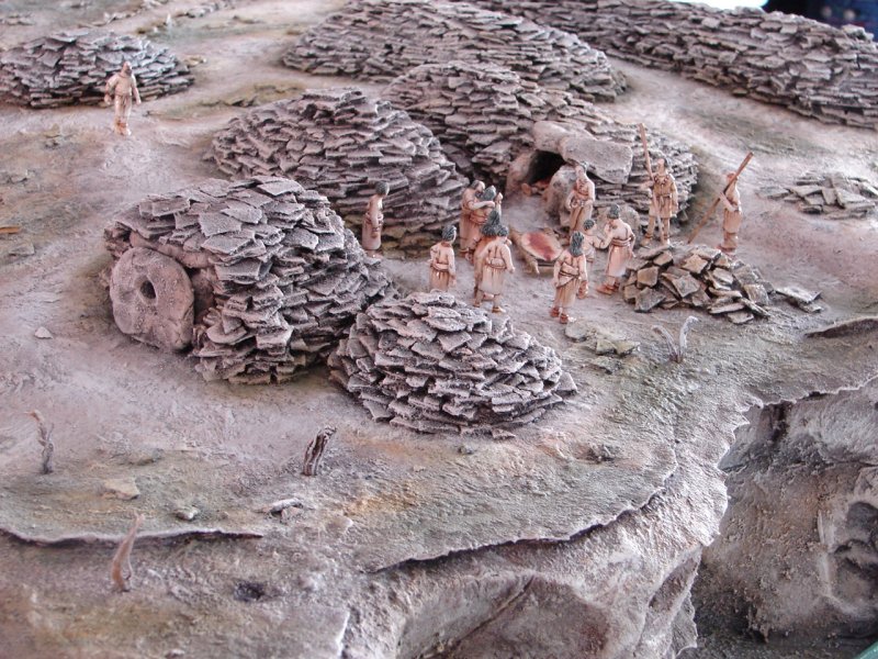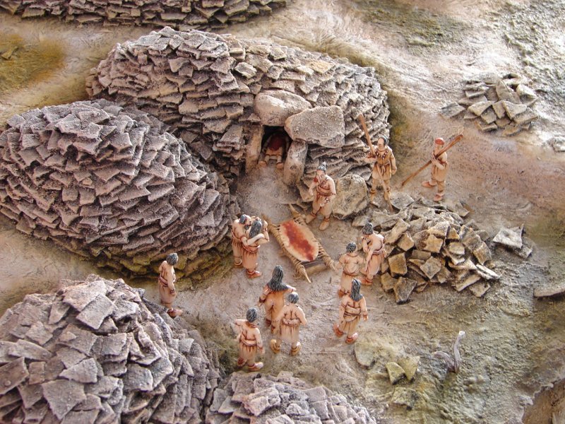 Village Néolithique | Otzi, l'homme des glaces | Polissage de haches | Village Chalcolithique | Chasse au cerf | Construction d'une maison sur pilotis | Greniers surélevés | Scène d'inhumation - Ensemble funéraire | Scène de labour |